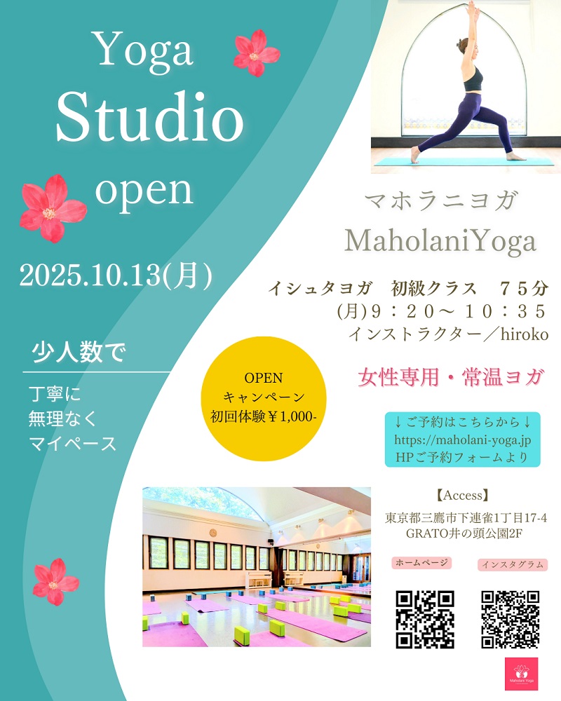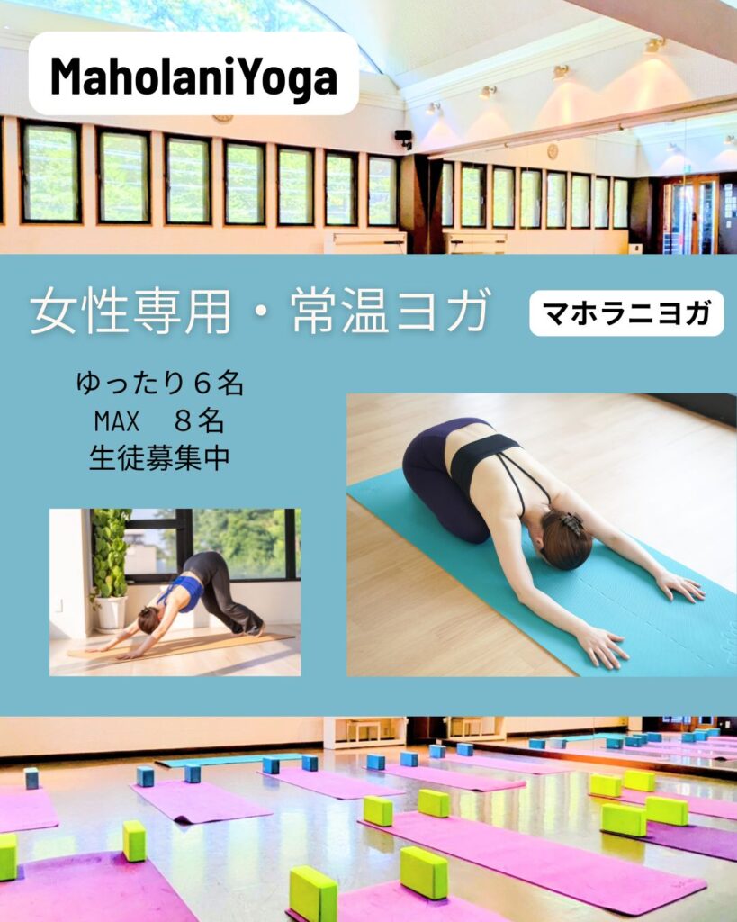 MaholaniYoga (マホラニヨガ)は、個人を尊重するISHTA(イシュタ)ヨガを取り入れた井の頭公園の自然に囲まれた環境の中で、心と体を解放し自分自身と向き合える女性専用の常温ヨガスタジオです。